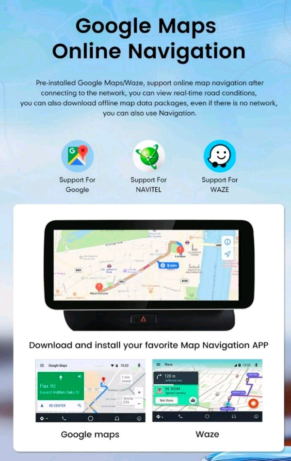 GPS Navigation: Built-in with support for Google Maps, Waze, and offline maps
